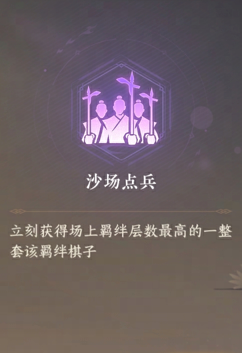 【沙场点兵】:立刻获得场上羁绊层数最高的一整套该羁绊棋子