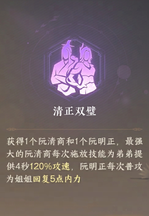 【清正双璧】:获得1个阮清商和1个阮明正,最强大的阮清商每次施放技能为弟弟提供4秒120%攻速,阮明正每次普攻为姐姐回复5点内力