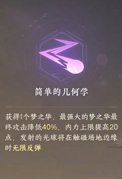 【简单的几何学】:获得1个梦之华,最强大的梦之华最终攻击降低40%,内力上限提高20点,发射的光球将在触碰场地边缘时无限反弹