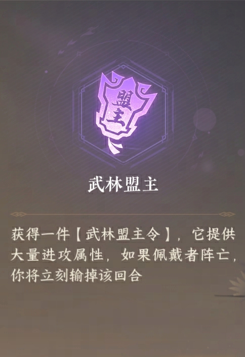 【武林盟主】:获得一件【武林盟主令】,它提供大量进攻属性,如果佩戴者阵亡,你将立刻输掉该回合