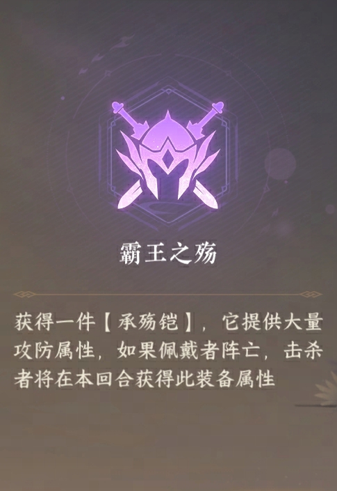 【霸王之殇】:获得一件【承殇铠】,它提供大量攻防属性,如果佩戴者阵亡,击杀者将在本回合获得此装备属性