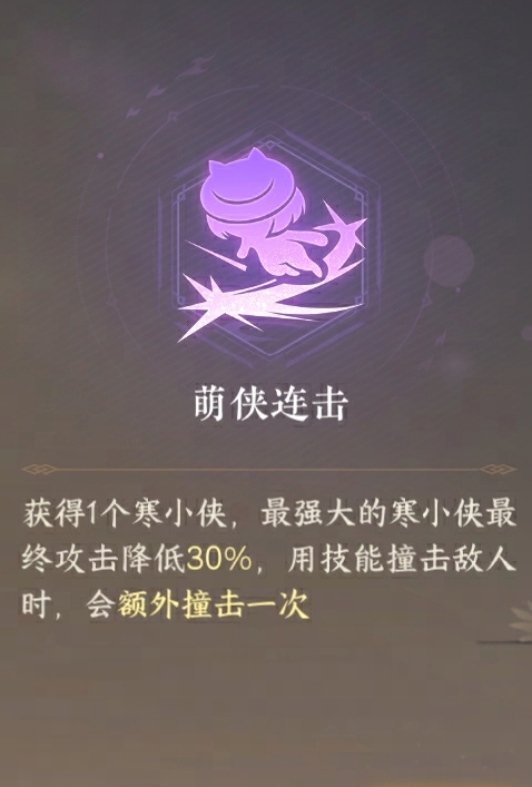 【萌侠连击】:获得1个寒小侠,最强大的寒小侠最终攻击降低30%,用技能撞击敌人时,会额外撞击一次