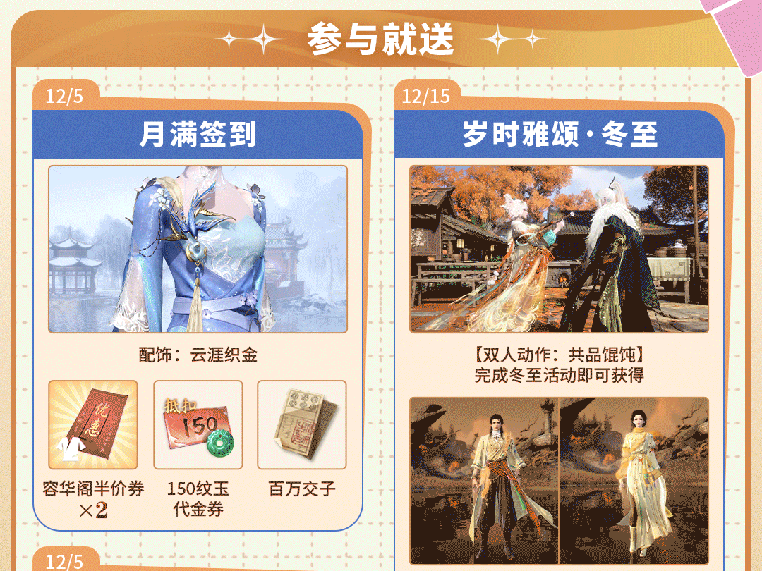 上线参与签到活动,即可领取容华阁半价券与配饰【云涯织金】。后续更有百万交子、150纹玉代金券、容华阁半价券等多重好礼!