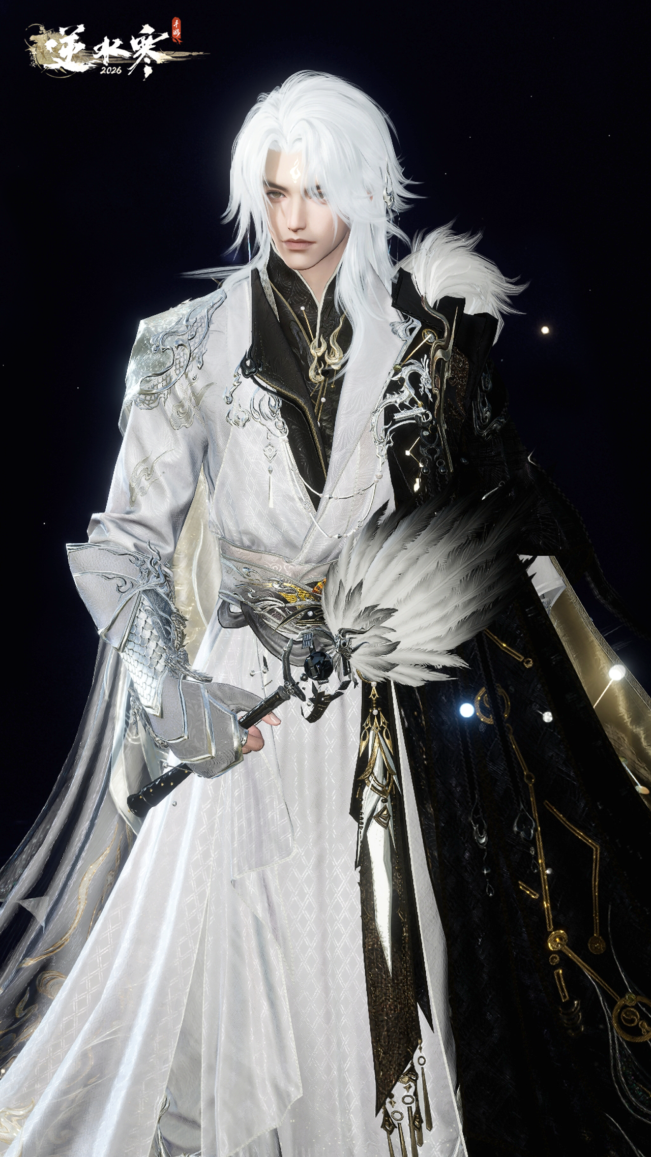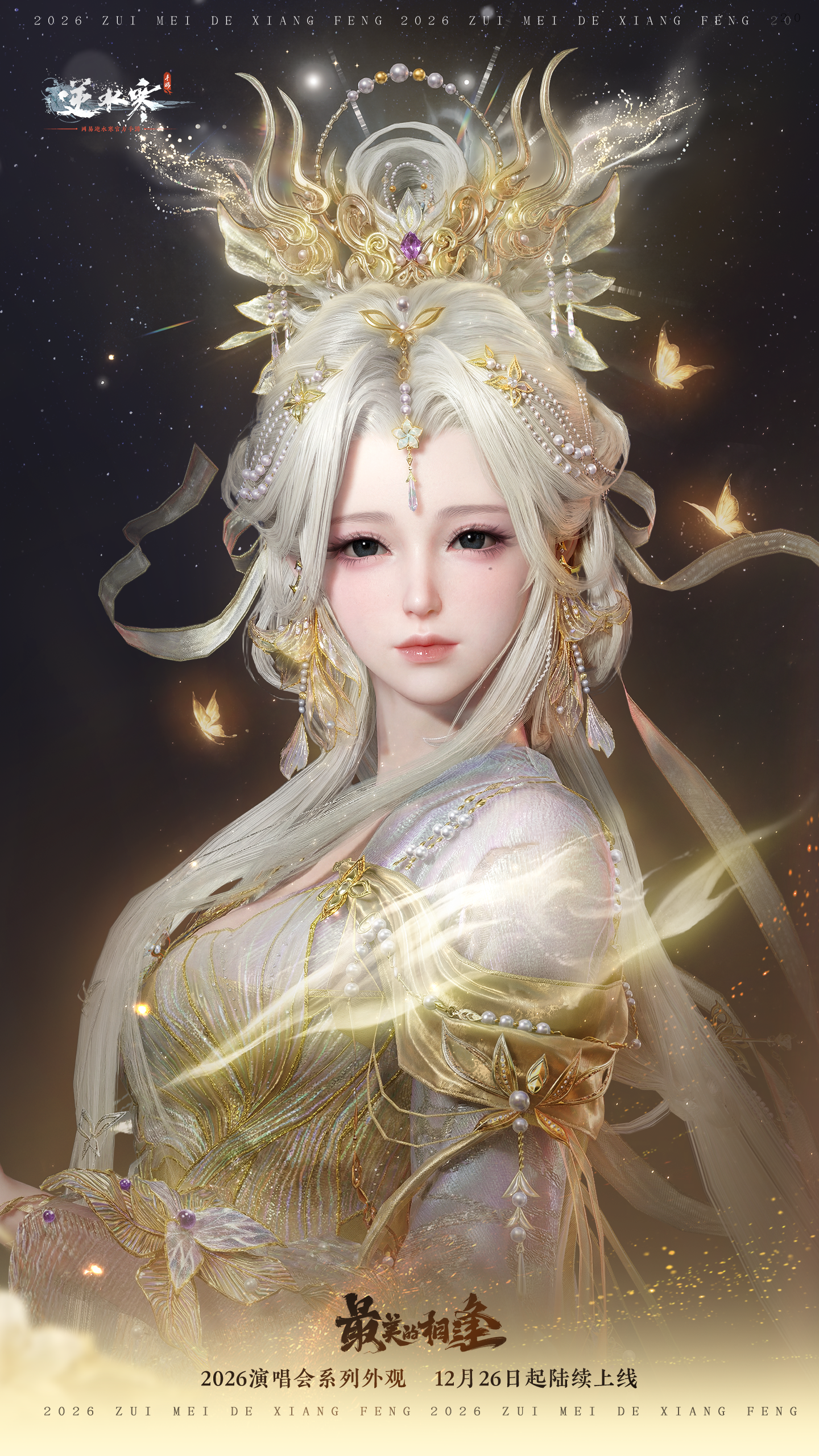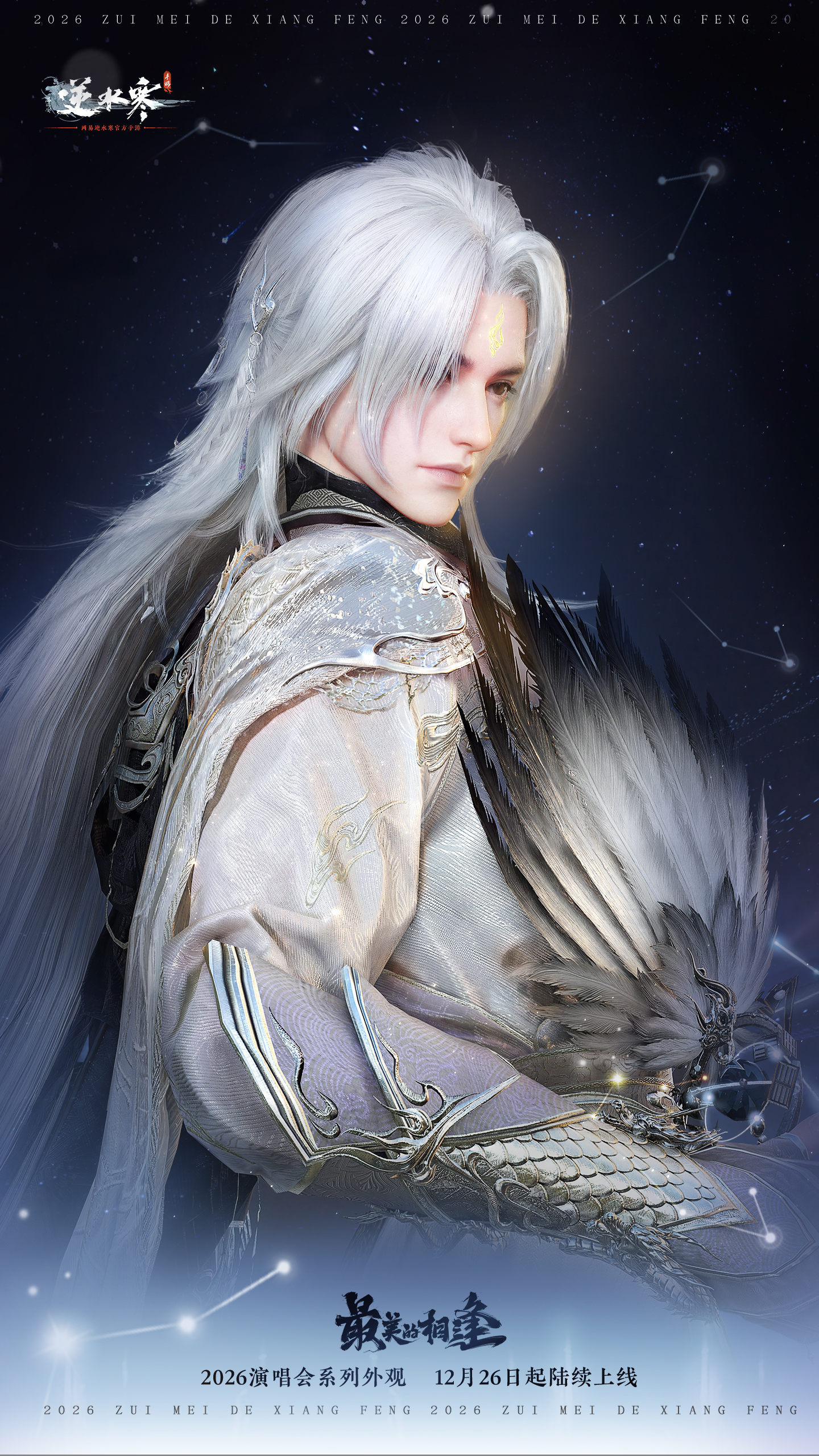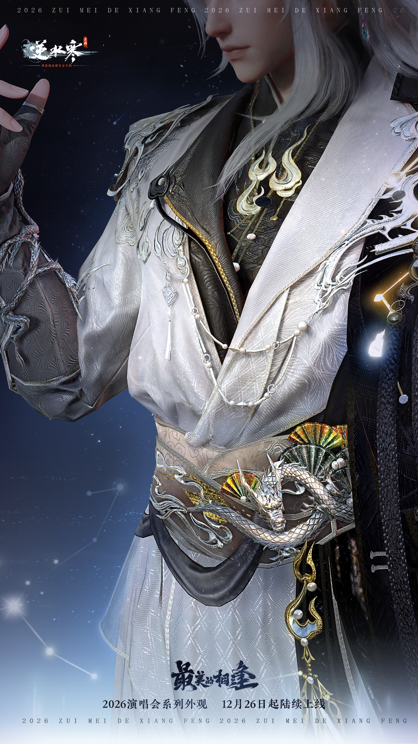 2026年1月1日(星期四)至2026年2月6日零点,逆水寒演唱会主题时装【星弈玄夜/璇霄织月】将限时上架商城,直售价2680纹玉,限时折扣价【1680纹玉】,可使用限定纹玉、代金券、半价券。获取时装后,各位同门还将同步解锁诸葛亮同款羽扇【墨衍摇风】、面纱【雾隐兰息】、单人动作【乾坤星衍/万芳云赐】和黑发头像。