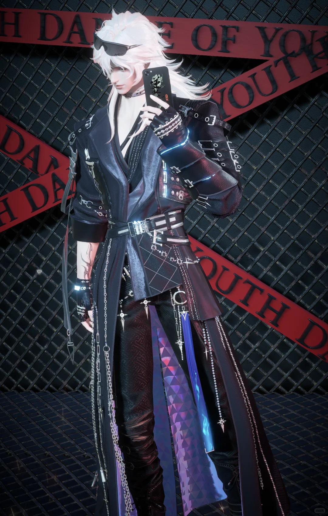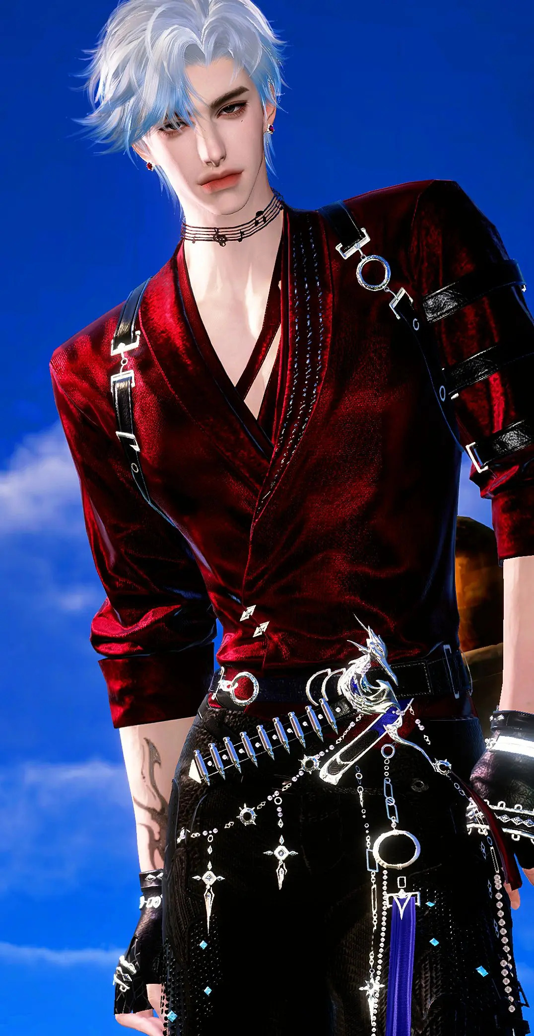 酒红色的衣料透着华贵的光泽感,黑色皮质的背带勾勒出健硕的身材,下装的黑裤与银色金属腰链则更添不羁之感。